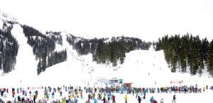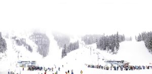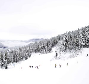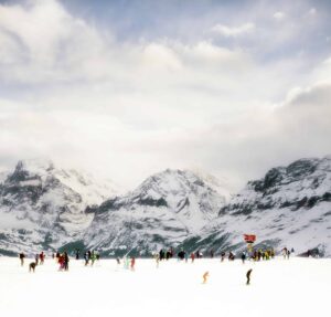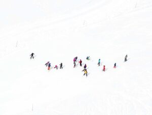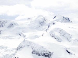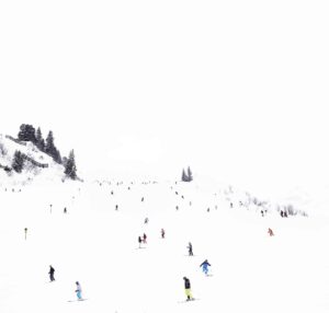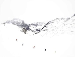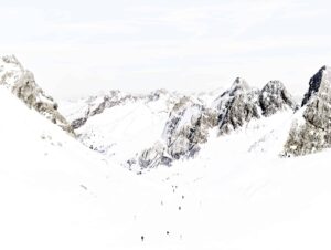In his series, Winter, Jensen-Nagle captures vast mountain scenes from various vantage points, often hanging out of helicopters to achieve his arresting aerial perspectives. His immersive, cinematic, large-scale photos invite viewers to lose themselves within the frame, sparking associations that might resemble the artist’s own memories of childhood winters spent in the Poconos. His images are prided on happenstance, showing humans completely enveloped by their environment, surrounded by the beauty of the moment, often evoking emotional, nostalgic or aspirational associations.